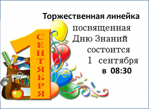 Линейка посвященная Дню Знаний 31.08.201831.08.2018 sch1 Торжественная линейка 1 сентября для учащихся 1, 2, 3, 4, 9 класса состоится в 08:30 Автобус отправляется из Сидоровки в 07:50 Классный час для учащихся 5, 6, 7, 8, классав 09:30 Автобус отправляется из Сидоровки в 09:00