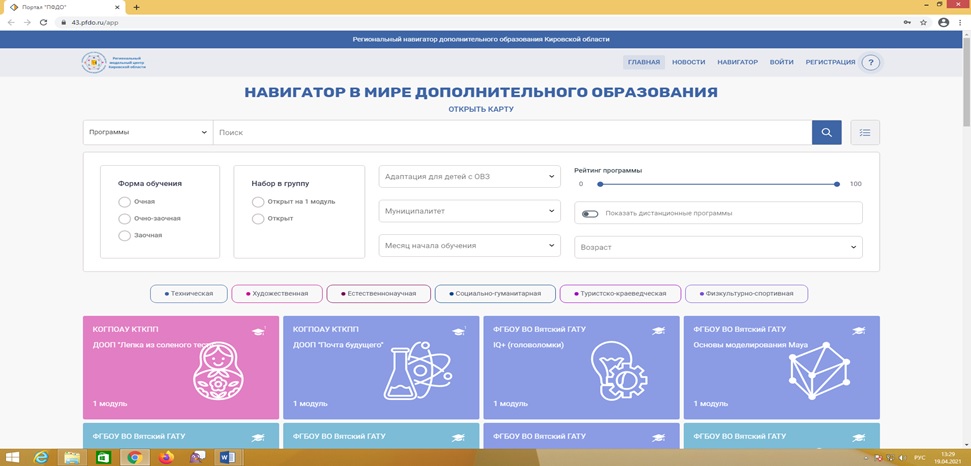 Это информационный портал с информацией о программах дополнительного образования по самым разнообразным видам деятельности, которые реализуются на территории Кировской области, в том числе в городе Кирове. Навигатор размещен в информационно-телекоммуникационной сети «Интернет» по адресу: https://43.pfdo.ru/.